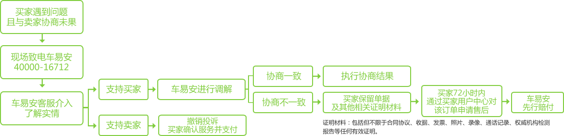 买家通过车易安在线购买进行的交易,在线下服务过程中卖家所使用的产品、服务流程、验收标准与其网上描述不符。买家可先与卖家协商重新服务、退款或退订。如协商未果,买家可根据本页面及车易规则规定发起维权,经判定维权成功的。车易安将划扣卖家保证金进行先行赔付,以保障买家权益。